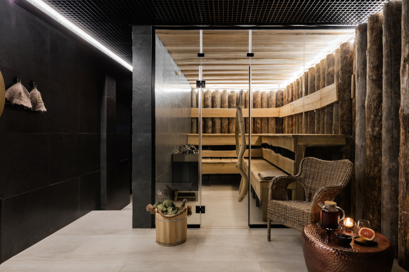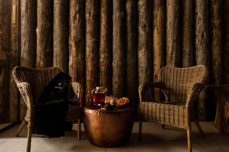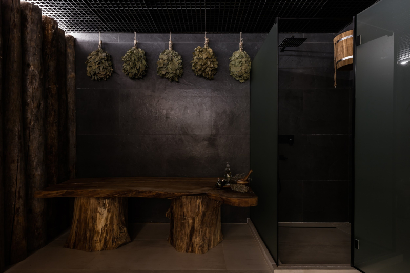 Баня выполнена из сухостойной карельской сосны Кело и натуральных материалов, которые создают непередаваемую атмосферу отдыха и единения с природой. Карельская баня состоит из двух пространств: парной и комнаты отдыха с персональной душевой кабиной, которая оборудована ведром с ледяной водой. В комнате отдыха расположен широкий деревянный полок для традиционных ритуалов парения и банных СПА-ритуалов.